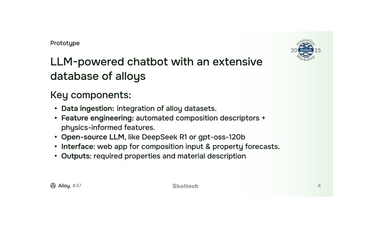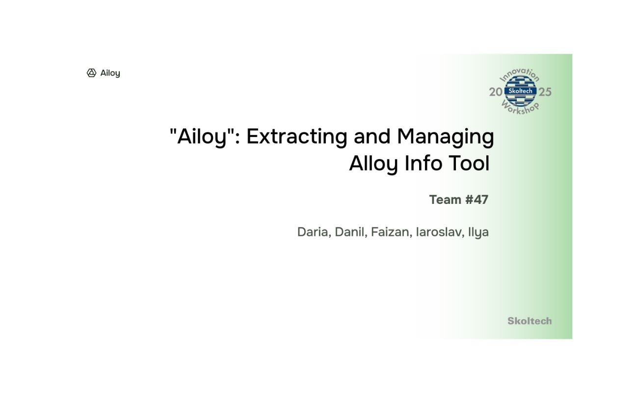 Ailoy is an AI-powered alloy discovery platform that leverages machine learning and materials informatics to accelerate the identification of novel metal alloys with desired properties. The system integrates data from multiple materials databases and research papers, providing users with real-time predictions, visual analytics, and intelligent recommendations. It supports both cloud-based and on-premise deployment, ensuring flexibility for industrial and research users.